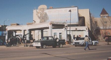 | Pancho Villa looks over Grand Ave. in Las Vegas, NM during the filming of "Blind Horizon" The sign says: "Buckle up before the border" |