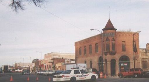 | Blocking off Grand Ave. in Las Vegas, NM for the filming of "Blind Horizon" The building with the spire was featured in the movie "Red Dawn" |