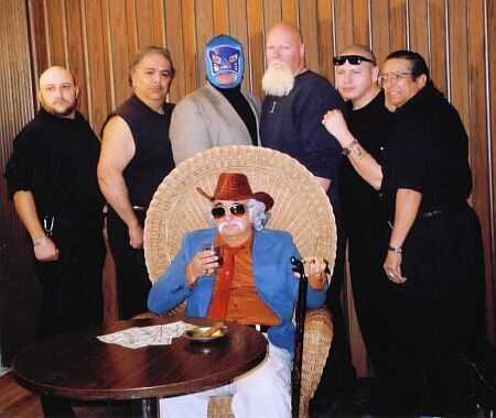 | The Cast: L-R: Anthony M. Trujillo, Paul Sanchez, 'El Gato' Dave Apodaca Mike McKenny, Jaime Yellowtail, Roman Solano Seated: The bad wrestling promoter (Ric) |