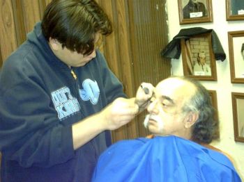 | Michael Barela does his part as a budding makeup artist as he applies makeup to his father |