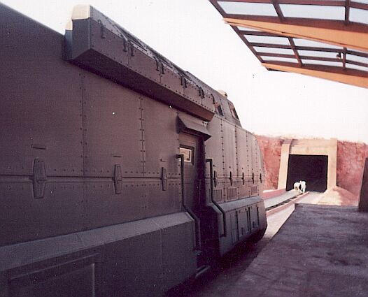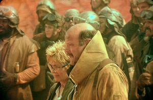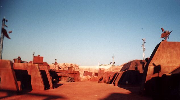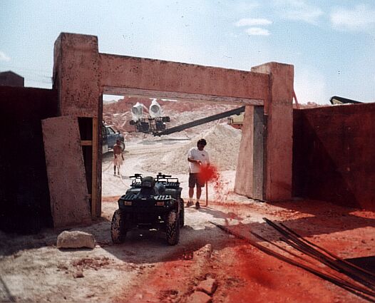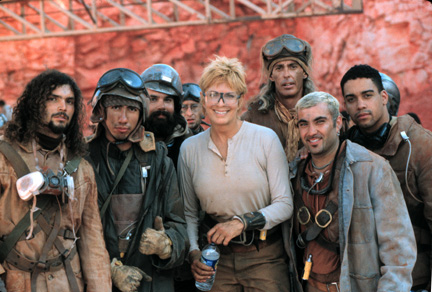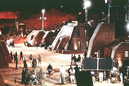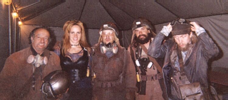 | A 'behind the scenes' shot of the street set of the 'Ghosts of Mars'. Many thanx to Mr John Carpenter, Neil Jacobs and Mr John Carpenter's website: www.theofficialjohncarpenter.com for the last three photos on this page Ric is the 2nd miner from the left in front of the bottom left fan |