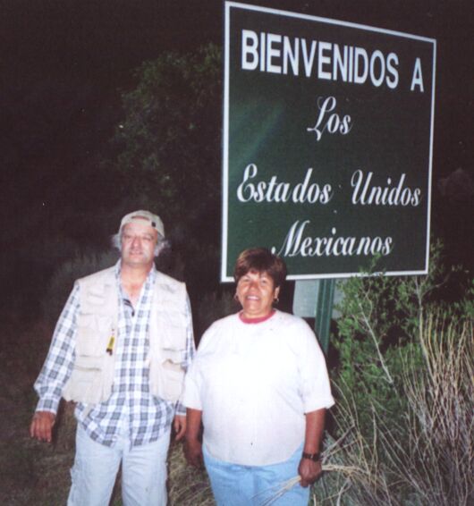| Ric and his wife Amalia. They played illegal aliens waiting to cross the river. The sign made us all laugh. |
