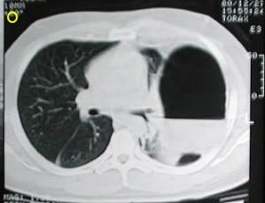 hace 9 meses, con hemoneumotorax tratado mediante drenaje con tubo de tórax.