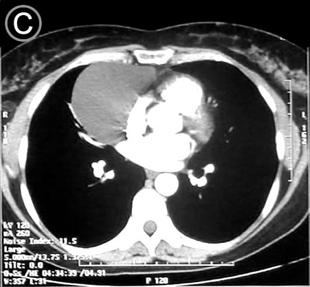 Giant Pericardial Cysts, Case Report., Christopher M. R. Satur et al, Ann Thorac Surg 1996;61:208-210.: Department of Cardiothoracic Surgery, Guy's Hospital, London, United Kingdom