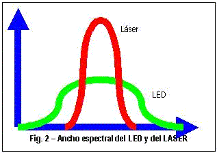 Se emplean como emisores de luz, tanto diodos LED como diodos LASER. Ambos son semiconductores de estado sólido y emiten espontáneamente luz cuando se los somete a una corriente eléctrica. Sin embargo, la potencia del LED es inferior a la del LASER. El problema es que el LASER requiere de un conjunto de circuitos de enfriamiento, dado el elevado calor generado a partir de su uso. De ambos, el LASER es más caro, aunque evidentemente es el mejor. El ancho espectral del LED y del LASER varían, el LASER particularmente tiene un ancho espectral menor, lo que significa que tiene mayor potencia, dada su baja disipación, como se ilustra en la figura 2. Las fibras ópticas son realmente inmunes a cualquier tipo de ruido, sin embargo, tanto el transmisor como el receptor son sensibles al mismo, razón por la cual deben tener el blindaje adecuado, a fin de introducir la información a la fibra de forma correcta.