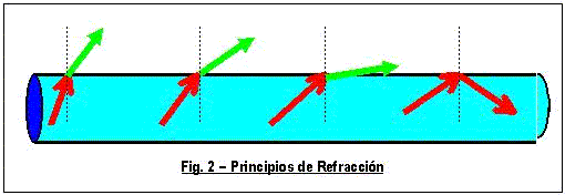 La fibra óptica está compuesta por dos capas de vidrio, cada una con distinto índice de refracción. El índice de refracción del núcleo es mayor que el del revestimiento, razón por la cual, y debido a la diferencia de índices la luz introducida al interior de la fibra se mantiene y propaga a través del núcleo. Se produce por ende el efecto denominado de Refracción Total, tal como se ilustra en la figura 2.