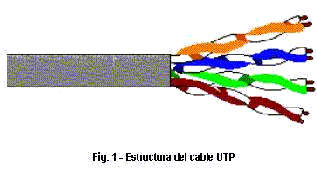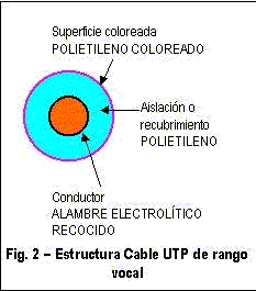 Por lo general, la estructura de todos los cables UTP no difieren significativamente, aunque es cierto que cada fabricante introduce algunas tecnologías adicionales mientras los estándares de fabricación de lo permitan. Así, la estructura de este cable es por lo general la que se muestra en la figura 2. El cable está compuesto internamente por un conductor que es de alambre electrolítico recocido, de tipo circular, aislado por una capa de polietileno coloreado. Debajo de la aislación coloreada existe otra capa de aislación también de polietileno, que contiene en su composición una sustancia antioxidante para evitar la corrosión del cable. El conducto solo tiene un diámetro de aproximadamente medio milímetro, y más la aislación el diámetro puede superar el milímetro.