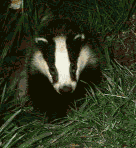 | This information is from the "Badgers" article on Encarta.com Scientific Name: Meles meles Badger, mammal characterized by short, strong legs; elongated feet that are more or less plantigrade (heels touch the ground); and straight, strong toes adapted to burrowing. Badgers are heavily furred, distinctly marked, and very strong. They live in dens and are mostly nocturnal. They have perineal glands, which emit a fetid odor. The pelts have considerable value as furs, and the hairs are used in the manufacture of shaving and other types of brushes. The common badger, also known as the European badger, is up to 90 cm (up to 35 in) long. It differs from the American badger in facial markings, dentition, and other details. It lives in forests and digs a deep chamber, where it spends the winter and where in spring it bears two to six furless and blind young. It is omnivorous; fruits, roots, beechnuts, eggs, young birds, small quadrupeds, frogs, snails, worms, and insects constitute its natural food. It also feeds on honey and on the larvae of wasps and wild bees; the shaggy hair of the badger is protection against stings. Read the rest of the badgers article on Encarta.com here. For some more great badger info, check out the Harrison Badger Homepage. |