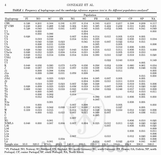 | I post above the table from Gonzalez et al. (2003) with the frequencies of different haplogroups in several European populations. Keep in mind that the Sub-Saharan markers are L1 (L1a, L1b, L1c) , L2, L3 (L3b, L3d, L3e) and N/M/L3, also known as L3* which is specific to sub-Saharan Africa, according to the very sources that Refuting Racial Myths used to show negroid admixture in the Portuguese matrilineal genetic lines. | |||||||||||||||||||||||||||||||||||||||||||||||||||||||||||||||