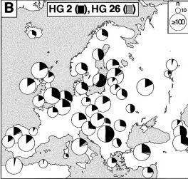 | The members of HG2 are thought to be the descendants of the Neolithic waves of migrants that arrived about 10.000 years ago from the Southeast and that are credited with introducing agriculture into Europe. As they moved Northwest with their new technologies, they displaced the local hunter-gatherer populations (and thus diluted HG1). Rousser et al. (2000) shares a different opinion. This study states that "chromosomes within this haplogroup are essentially undefined and are likely to consist of a set of different of discrete sublineages that themselves probably have greater geographic coherence. Consistent with this, HG2 (...) constitute the only high frequency lineage that does not show clinal variation. Because of this unimformativeness, HG2 will not be further considered here." HG2 is most common in Southern and Central Europe. |