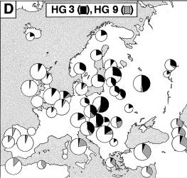 | HG9 reaches its highest frequencies (33%) in the Caucasus and in Anatolia. A simplistic interpretation is that HG9 chromosomes were carried in a major demographic expansion of agricultural migrants from the Near East. HG9 has been dated at 14,800 � 9,700 YBP. | ||||||||||||||||||||||||||||||||||||||||||||||||||||||||||||||||||||||||||||||