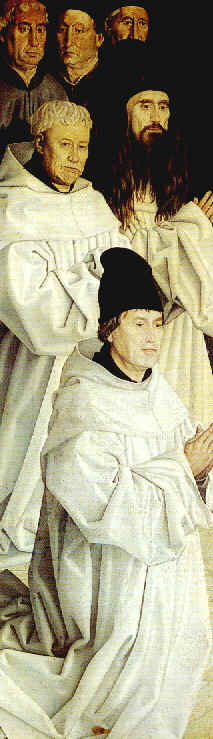 | The first panel depicts the clergy. As it can easily be noticed, there is not one single Nordic individual represented. Notice the wide Mediterranean/Alpine noses and the dark brown hair in most men. The friars spent most of their time enclosured in the monasteries, which meant that their skin would be lighter than that of the ordinary outdoor worker. Still, only one out of six has a pale complexion. Maybe two of those friars represented are Alpine or at least Alpinized to some extent. Most are, of course, of Iberian Mediterranean stock. |