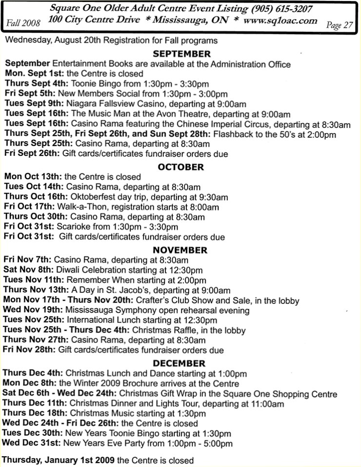 | Iranian Seniors Group Social Activities | Wednesdays 1:30-3:30pm | Administration Office | (905) 615-3207 |