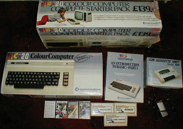 Commodore Vic-20 computer. Boxed. Inc. manual, power supply, modulator aerial lead and C2N tape deck. Also four game cassette (Race, Hoppit, Type-A-Tune + Blitz), Introduction to Basic (boxed with all the bits) and Escape from the MCP, Arcadia and Caterpilla. Plus the cartridges Cosmic Cruncher, Avenger and Sargon II Chess. Computer a bit discoloured. �50 including UK postage.