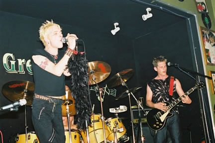 | Formed in the Bournemouth area of Hampshire, little is known about this band other than they rock like the Stooges and MC5, and throw in the glamour of Hanoi Rocks and the early Manics. If you add the vocal stylings of Peter Perrett and the new wave pop formula of The Only Ones then the mixture is complete. Their took their name from the title of a poetry booklet by Patrick Jones (brother of Nicky Wire from the Manics), and the man himself even wrote to the band with encouragement when they asked for his permission. Fans of the current 'garage' rock scene (The Hives, The D4, The Datsuns etc) will not be disappointed, and there are bits of all your classic punk albums (Dead Boys, Ramones, Clash, Pistols) here in attitude as well as sound. Other influences abound both literary and celluloid help to make Guerilla Tapestry more interesting than 95% of any of the current darlings of the music scene. Their gigging schedule is mainly based in and around Hampshire at the moment, with the odd foray to the capital (including a support slot with UK Subs). If you know what's good for you, then you'll visit their website immediately! (web address below) Your reward is a chance to hear their music and watch some live performances online, so you can find out if you like them without it costing you anything. As if that's not enough, you can also order a copy of their Demo CD by supplying your email and postal address (recommended!). So why are you still reading this?! IF YOU LIKE THESE, YOU'LL LIKE GUERILLA TAPESTRY: MC5, The Stooges, Manic Street Preachers, Hanoi Rocks, The Only Ones, The Hives, The Ramones, The Dead Boys, The Sex Pistols, S*M*A*S*H, New York Dolls, N.Y.Loose. |