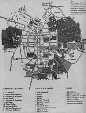 "(La) Ciudad (era) tranquila, con el encanto de sus huertas que un clima benigno y agua en abundancia hacían hermosas y productivas... Los templos, como en la mayor parte de nuestras ciudades, son allí los edificios más importantes. Las casas son bajas y de exterior modesto. Las limpias calles, anchas y rectas, cuidadosamente empedradas, tienen todas una zanja en el centro para constituir el único sistema de drenaje que existe... Hay vendedores ambulantes de fruta, de dulces, de charamuscas, de gorditas de cuajada... Es muy abundante y variado el comercio callejero... todas las noches, grupos de amigos, en espera de la hora de la cena, y de ir a la cama, se reúnen en las bancas de la Plaza de Armas y allí se cuentan la diaria chismografía."15