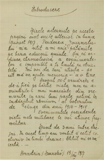 | Hornstein/Szarvko, 15.VIII.1917 In luna Iulie a anului 1914 eram in Bucuresti. Tinta-mi era de-a ma interesea de conditiile necesare pentru examenul de primire la Scoala nationala de poduri si sosele. O mare senzatie preocupa creierii tuturora: Printul de Coroana, mostenitorul tronului habsburgic Ferdinand, fu ucis dimpreuna cu sotia sa in Serajevo [1] de studentul sarb Princip[2]. Tot felul de intrebari pluteau prin vazduh: "Fi-va mana Sarbiei?"... La caz ca "da", "va cere oare Monarchia satisfactie?"..."Care va fi atitudinea celorlalte state europene?"... "E razboiul inevitabil?"... Nervii tuturora erau incordati asteptand noutatile zilei de mane. Zile nefericite! Clipe fatale! Voi ati desteptat planuri, pofte de cuceriri! Voi ati rascolit din adanc jarul pacinic al vetrii europene, invalit in patura cenusii! In aceste zile s'au aprins, pan'la clocotire, patimile nebune ale acelor state arogante ce, bazate pe propriul militarizm, au binecuvantat momentul de infaptuire a secularului vis teutonic!... Scriu aceste sire in August 1917. Inca nu inspiram aerul pacii. De aceea, reflexiile de mai sus s'ar putea potrivi poate mai bine la sfarsit. Acest sfarsit insa il prevad.Scurt! Profesorul Murgoci imi da instructiile de lipsa, iar pe drum, spre casa, in Predeal, ma ajunge declararea de razboiu a Sarbiei din partea Monarchiei Austro-Ungare. Circulatia cu trenul intre Predeal-Brasov e intrerupta. |