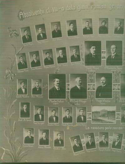 | Fragment din tabloul promotiei 1913-1914 a Liceului Saguna din Brasov Click pe imagine si in pagina Galerie se poate observa intr-un format marit atat portretul lui Lucian Blaga cat si al autorului jurnalului, Ioan Moarcas. Imagine din arhiva lui Vlad Aron Moarcas. |