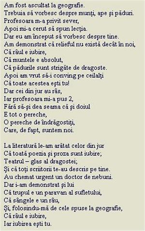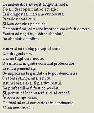 | un subiect deosebit de incitant: �Poetul meu preferat�.As fi vrut sa scriu despre Lucian Blaga. Curiozitatea m-a facut sa-l intreb pe colegul din fata care este poetul lui preferat. Era Mihai Eminescu. Cel din spatele meu scria tot despre Mihai Eminescu. Din aproape in aproape, am aflat ca intreaga clasa si, posibil, intrega scoala si, asa cum se vede acum, intrega natiune, avea si are ca poet preferat pe Mihai Eminescu. Siderat si oarecum revoltat am hotarat sa scriu si eu despre Mihai Eminescu. Aceasta lucrare a atras mania colectivului de profesori de la liceul meu asa ca am fost chemat la cancelarie sa dau socoteala pentru aprecierile infamante la adresa �poetului national� si �Luceafarului poeziei romanesti�. In final trebuie sa vorbesc despre rolul hotarator al dascalilor in formarea viitorului elevilor. Fata mea cea mare a iubit tare mult matematica. Asa de mult incat dupa examenul de admitere la liceu, pentru relaxare, inca mai rezolva probleme de matematica. Intalnirea cu profesorul din primul an de liceu trebuia sa fie o completare a acestei pasiuni, cumva exotice pentru o fata. Nu a fost chiar asa deoarece, in ciuda apetentei sale pentru raspunsuri si demonstratii, la tabla erau scosi doar copiii care faceau meditatii in particular cu dom� profesor. Dupa un consiliu de familie, am hotarat sa ma rog de dascal sa o ajute si pe fata mea sa aprofundeze notiunile de matematica in particular. Domnul profesor a fost de acord iar fata mea a absolvit cu brio facultatea de istorie si refuza cu obstinatie sa mai vorbeasca despre matematica. Ati auzit? Suna clopotelul. |