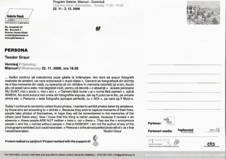 | Astazi continui sa colectionez poze gasite la intamplare. Am dorit sa expun fotografii realizate de amatori, ce i care actioneaza dupa clisee. Oamenii se fotografiaza din dorinta de a fixa momentele din viata, cu speranta ca vor ramane in memoria celorlalti (si a lor). Acum stiu ca acest lucru este mai degraba inutil, pentru ca denota o absenta: aceste persoane NU SUNT nici acolo , nici aici. Oameni fara nume si nume fara oameni, adica NIMENI. Nu sunt autorul nici uneia dintre fotografiile expuse, dar as fi putut sa le fac pe oricare dintre ele. �Persona� este fotografia aproape perfecta, cu NOI, pe care as fi facut-o. Teodor GRAUR |