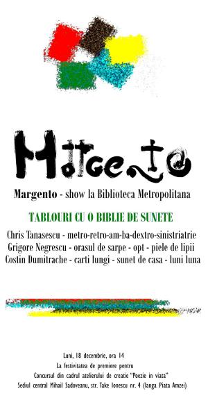 | Dragi prieteni, Va invitam la urmatorul eveniment MARGENTO: MARGENTO � show la Biblioteca Metropolitana �Tablouri cu o Biblie de Sunete� � Chris Tanasescu � metro-retro-am-ba-dextro-sinistriatrie Grigore Negrescu � orasul de sarpe � opt � piele de lipii Costin Dumitrache � carti lungi � sunet de casa � luni luna � luni,18 decembrie, ora 14.00,������������������������������������������������� la Festivitatea de Premiere�pentru Concursul din cadrul Atelierului de Creatie �Poezie in Viata� Sediul Central Mihail Sadoveanu, Str Take Ionescu no 4, langa Piata Amzei Raluca Andreia Tanasescu Manager MARGENTO +40746122326 http://www.margento.ro/ [email protected] |
