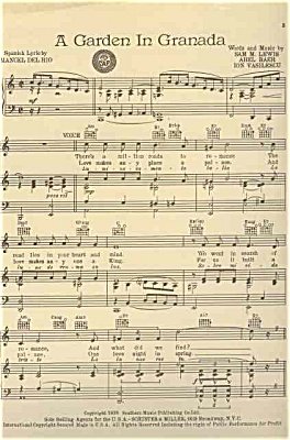 Sa ma intorc insa la Escadrila alba, filmul facut in 1944 - pentru Lucia Sturza-Bulandra avea sa fie al doilea si ultimul film - isi va continua marea cariera artistica pe scena - Marcel Anghelescu avea sa mai joace in multe filme - cel mai mult m-a impresionat in Darcl�e, unde interpreta un rol secondar, pe compozitorul Leoncavallo, punea in rol atata caldura, atata omenie, mi-a ramas peste ani imaginea lui. Asadar doua filme a caror muzica era compusa de Ion Vasilescu. Mai exista insa un film si mai vechi, din 1938, produs la Hollywood, Starlight Over Texas, cunoscut in Europa sub titlul Moonlight Over Texas. Un western, cu actiunea pe undeva prin Texas, ca mai toate westernurile. Ion Vasilescu a realizat banda sonora a filmului. Iar una din melodiile din film este compusa de el. A Garden in Granada, am reusit sa gasesc pe web o imagine a portativului purtand notele melodiei, si imaginea copertei discului: melodia compusa de Ion Vasilescu pentru filmul Starlight Over Texas. Versurile aveau trei coautori: Sam M. Lewis, Abel Baer si Ion Vasilescu. Melodia era cantata in film de actorul principal, Tex Ritter, un singing-cowboy al anilor 30-40, star in westernuri de categorie B, cum este prezentat pe imdb. Versurile melodiei au si o versiune spaniola, realizata de Manuel del Rio, En Los Jardines De Granada. In versiunea spaniola melodia avea sa fie cantata de catre Rafael Medina, La Voz Rom�ntica de los a�os 40. Es una canci�n fabulosa, aveam sa gasesc pe web! Si scris cu majuscule, LA CANCI�N ESTA SUPER |