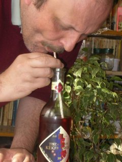 Cu ajutorul bancnotei rasucite in forma de tub, am sorbit cu usurinta din vin. Am castigat pariul, banii raman la mine. [Fotografii facute de Gyorfi-Deak Geza] |