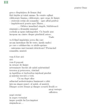 From: oana l. Date: Apr 2 [...] in momentul in care am ascultat [shostakovitch] "russian walz" am fost de-a dreptul uluita. Asta e ultima melodie pe care am ascultat-o in trei (eu, Serban si papa), anul trecut in toamna cind am fost impreuna la Bucuresti [...]. Ne-am simtit ca in copilarie, copilaria noastra radautena cu miros de toamna si de Medeleni. Acolo am simtit intr-adevar ca am fost copii. Bunica a fost un om ca o piine calda, iar de strabunica mea, Generalul sau Jandarmul Sef, o sa imi amintesc mereu cu mare drag. [...] Merci [...] pentru valsul acela despre care papa spunea ca e de o melancolie covirsitoare si ucigatoare... *** From: oana l. Date: Apr 3 Va trimit citeva articole dedicate tatalui meu de colegii de la ziarul unde a publicat mai bine de cinci ani si de cei de la revista "Bucovina literara" unde a fost traducator ceva vreme. |