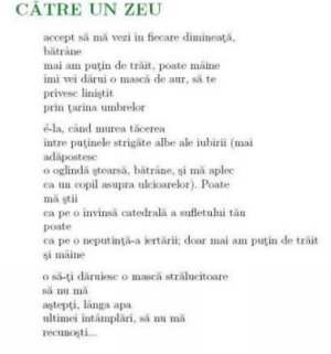 | de zece (nu ca mine) si este foarte disciplinat. Ii scrisei imediat biletzel cu o poezie, iar el imi raspunse cu un alt biletzel cu o alta poezie. Intr-o zi ma inspirai din povesti batrinesti si-i scrisei elevului din antepenultima banca poezia despre Dumnezeu care se bucura sa vada curcubeul de biletzele cu poezie de iubire dintre copiii de la scoala, peste banci.