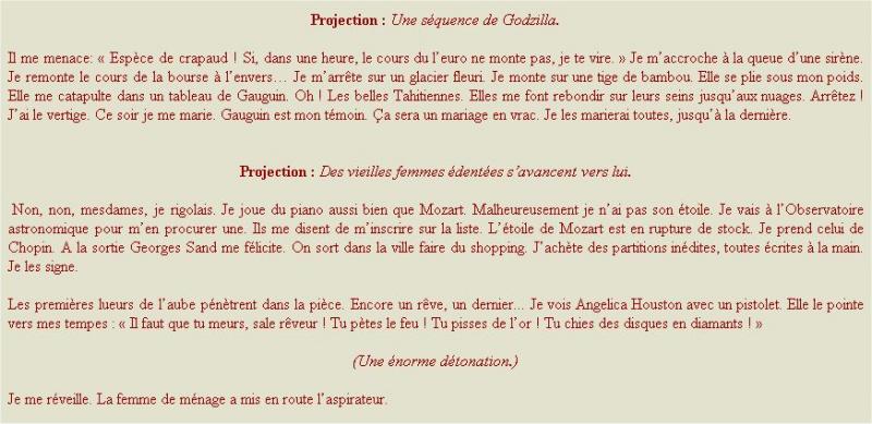 | Traduceri Moartea Moarta (fragmente) ..Cu o extrema voluptate mentala si intr-o stare de excitatie afectiva si psihica neantrerupta eu urmaresc..in mine si in afara mea acest numar acrobatic.. infinitul Salturile contemplative, active si lubrice le execut simultan, culcat si in picioare .... as putea muri de o mie de ori fara ca o problema fundamentala cum e moartea sa mi se aplice in dimensiunea ei filozofica .... Ce mare, ce deceptie monstruoasa din cauza propriului meu personaj drogat de evolutie cu o aglitate neantalnita la frontiera dintre somn si trezie intre da si nu posibil-imposibil ca sa ma trezesc brusc intr-un decor inversat o lume de iluzii de erori fundamentale care nu iarta si care transforma inegalabila mea inexistenta existenta intr-o rana... ***** H�ros limite (fragmente din finalul textului) Fiecare obiect poarta numele numarului de gauri care servesc viata contra mortii, moartea moarta, viata vie, o viata int-o viata, poarta numarul de gauri care a servit in a-l confectiona. Iata numele cifrelor, numele cifrelor in excees, numele extreme de ex ex expansive, exccentrice si extreme, exacte ale acestor obiecte: I 4320 II 4896 III 4608 VI 1152 X 2304 . . . XI 3168 XV 9216 XVI 0 |