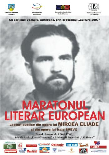 | maratonului a putut fi urmarita la postul Radio Romania Actualitati, initiatorul proiectului, incepand cu ora 12:00, pe 9 mai, cu citate din Eliade, concomitent cu restul tarilor participante care au propus ca scriitori reprezentativi pe Italo Svevo - in Italia, Carmen Conde - in Spania, Konstantinos Kavafis - in Grecia, Iordan Radicikov - Bulgaria. In fiecare tara organizatoare a existat si un eveniment "in oglinda", de dimensiuni reduse, de genul "serilor literare", unde vor putea fi citite sau ascultate operele propuse de celelalte tari. Doamna Sorina Manuela Man este directoarea programului pentru Romania iar Coordonatoarea Maratonului Literar European la Suceava este scriitoarea Angela Furtuna. Ideea organizarii unui maraton literar european a pornit in urma cu 5 ani, in Italia, la initiativa unui profesor al Universitatii din Verona, Mario Allegri. Dl. Allegri preda literatura italiana la Universitatea din Verona si este membru al Comitetului stiintific al Fundatiei Aida. In 2002 a fost organizata prima lectura publica. A fost aleasa capodopera lui Dante , Divina Comedie . Sute de cetateni s-au implicat in lectura integrala si continua a faimoasei scrieri. Succesul primei experiente a fost deosebit de incurajator, asa ca ea a fost repetata si in anii urmatori: in 2003 s-a citit Orlando furioso de Ariosto ; in 2004, a fost randul Iliadei lui Homer, in traducerea clasica realizata de Vincenzo Monti; in 2005 s-a citit Cantonierul sau Rerum vulgarium fragmenta de Petrarca . In 2005 s-a lansat ideea extinderii proiectului, prin implicarea mai multor tari si orase din Europa. Raspunsul nu s-a lasat asteptat. Maratonul Literar are din 2007 o dimensiune europeana: rezultatul final este acest proiect "Maraton Literar European" care se realizeaza cu sprijinul Comisiei Europene, prin Programul "Cultura 2000". Evenimentul marcheaza 50 de ani de la semnarea Tratatului de la Roma, actul fondator al CEE (Comunitatea Economica Europeana). |