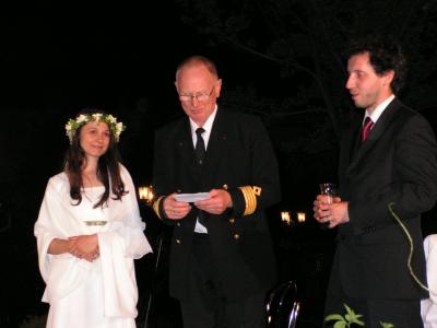 | Tone de fotografii sunt in joc atunci cand ai alaturi artisti ai imaginilor. Un busuioc la rever, primii pasi de mana cu noul statut, sedinta foto pe iarba moale din Santa Fe. Micuta Mateia, lasata libera pe iarba, incepe sa mearga de-a busilea de parca e o jucarie cu cheitza. Corina, aplecata langa ea, o urmeaza cu pofta de joaca. Mateia ajunge in bratele tatalui ei. Poza de grup. Placerea de a ne imortaliza cu totii. Aici. Acum. Mateia intinde degetutzele spre nasturii stralucitori de la uniforma capitanului de cursa lunga. -Women�:) -All time..:) But isn�t gold�. -Yes...Men� always �:) Sapca sa a tronat intreaga seara in cadrul acela clasic. Langa lambriuri, faiantze, plush, piele si lemn.Toate cu stil. �Mon Capitain� a fost vedeta serii. |