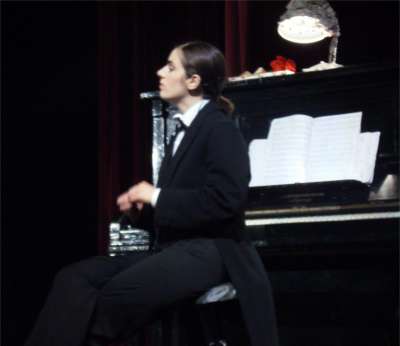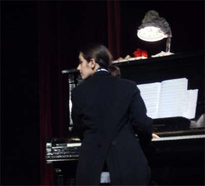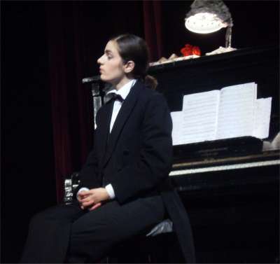 Cea care sta permanent in scena, cea care "deruleaza" povestea, Irina Sarbu, ofera nu doar muzica lui Henry Malineanu ci si un schimb sclipitor de replici fiecarui actor, amintind de rolul flasnetarului, jucat alternativ |