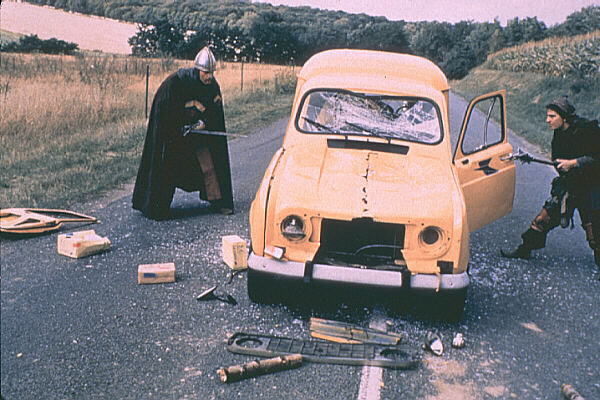 The Renault 4, which featured in "Les Visiteurs" starring Jean Réno, after it was attacked. Its windscreen and all its lights were broken, its bonnet damaged, and its wing mirror and passenger door taken off.