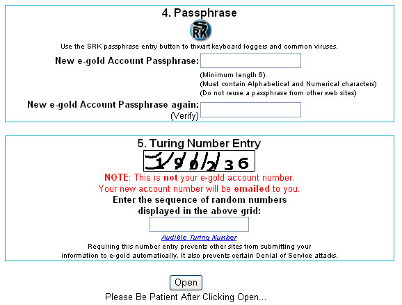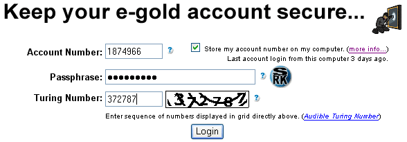 Step 1 : Click on Access your Account at the e-gold site. Step 2 : You will see a login page like below. Fill in your account number, your password and the turing number shown. Click on Login .