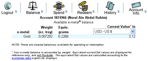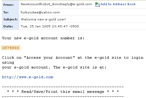 Step 4 : You will receive an e-mail from e-gold which contains your e-gold account number. Check your e-mail and it might just look like below. (Note : if it's not in your inbox, it might be in your bulk/junk mail)