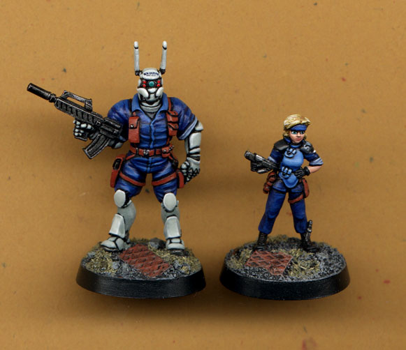 These figures are made by Ground Zero Games and produced in Oz by Eureka miniatures. I was real surprised when I saw them at a con and snapped them up, there's also a version with Deunan sitting on Bri's shoulder like in the pic which I'll paint soon. It's hard to see but I actually painted "Briareous" on Bri's forehead, it's a bit fuzzy though. |