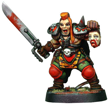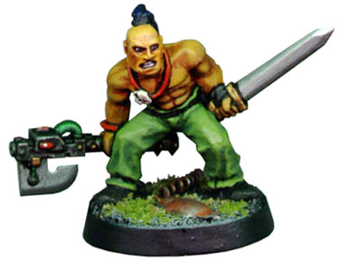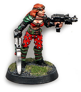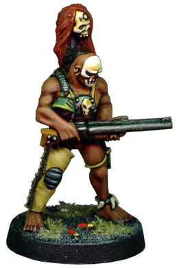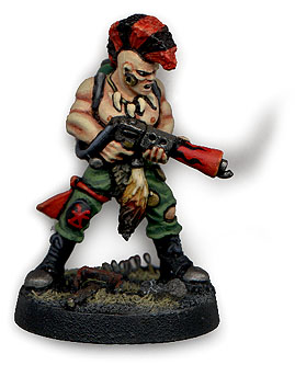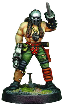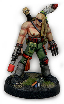 This is the early version of "Vega" the gangs Leitenant. As the caimpaign went along he was almost a double of "Chainsaw" but of course never challenged for Leadership since he was having too much fun. The mini is a Future Savage mini with a GW Laspistol added.