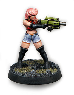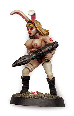 Meet the infamous Bazooka Bunny my first effort after reading the Macho Women with Guns rulebook. She was originally a Heartbreaker Chaz Elliot mini of a barbarian girl charging with a spear. I ditched the spear gave her an eldar missile launcher, made the ears, added the bow tie and converted her boots into high heals. Most people like the Coke can too.