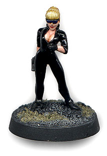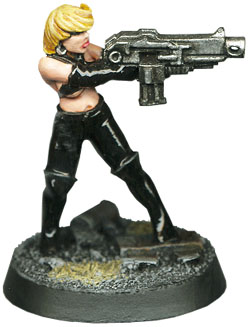 This lovely lady hasn't got a name yet but I love that catsuit. She's a mini sculted by Ground Zero Games in the UK but reproduced locally by Eureka Miniatures. I modified the figure by replacing her gun with an old marine boltgun. If you are wondering how I painted the realistic looking latex suit, here's the process: First step a complete coat of solid black with only the tiniest of highligts on the edges of her boots. Then at least 3 coats of Tamiya Gloss Varnish with a days drying time between coats to get that deep reflective shine.
