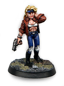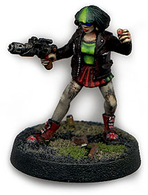 This is an Future Warriors rebel women. I converted the pistol into an autopistol so I could use her in Necromunda. The ripped nylons are the highlite of this mini. Oh and the Union Jack Doc Marten boots.