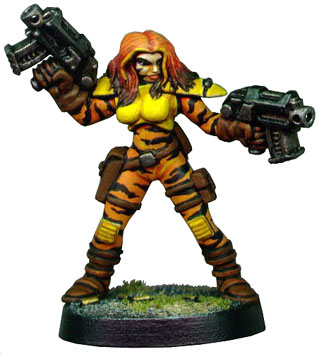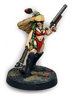 This is a Future Warriors female savage with gun. Although originally she just had a pistol I cut it down and added new barrels to make a double barrel shotgun so I could use her in Necromunda as a scout.
