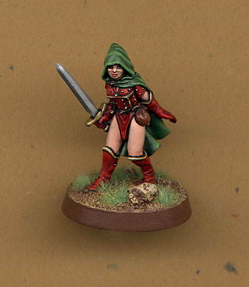 This is Claudia Tiranti Fabius' young aprentice. She's new to the adventuring game and got REALLY barbequed a couple trips in. She recouperating at the moment. The mini is an old Julie Guthry Grenadier personality.