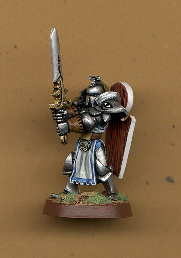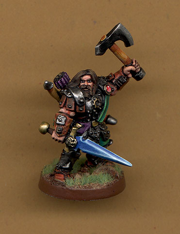 This is Sir Gabrius Helmson, Paladin of Helm and self proclaimed protector of Milbourne and leader of the Party. Although I'd never agree with that. Especially considering his lack of party tactics. The mini is a Chronopia Firstborn Iron Guard standard bearer with the sword from the Black Sister champion.