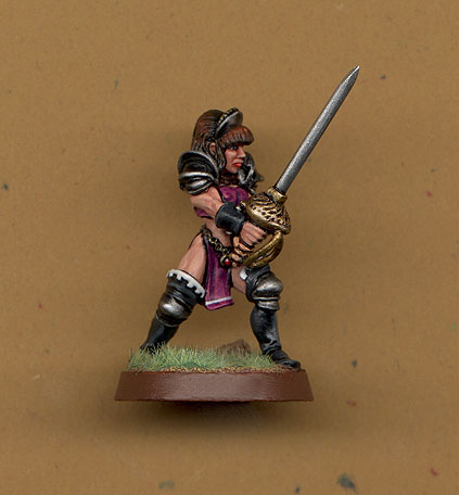 This is Lady Indrisari, reknowned swashbuckler and strongwomen and a person of few words. The mini is the Chronopia Firstborn Black Sister champion. I changed the sword and made the rapier from a thinner blade and made the bucket from Green stuff.