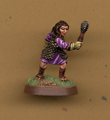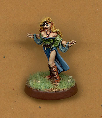 This is Lady Mariana Staarshine Priestess of Mystra. The mini is an old Hobby Products female cleric. I loved the pose on this one.