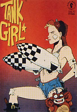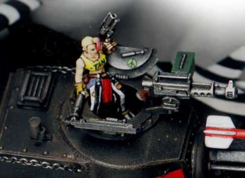 This is my version of Tank Girl - as in the comic and movie. I was inspired by the GW Escher juve mini which when I first saw it I knew was based of the Tank loving one and I realised I had to make a tank to match. The model is aiming for the look of the movie tank but I had to cut some corners although it is based on the same tank chassis as in the movie. |