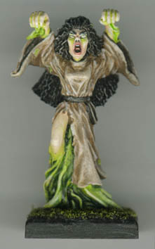 This is the Banshee from the Ral Partha Ravenloft boxed set. I was really happy with the way misty green blends from the base into her skin, as well as the glow from between her fingers. |