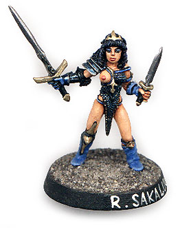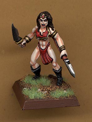 A couple of lovely ladies with Big wepons. The one on the left is a vampire from Reaper minis, I have a fealing she's now OOP. The blonde on the right is the Blade maiden leader for the Sons of ronos in Chronopia. I like the way her hair turned out. |
