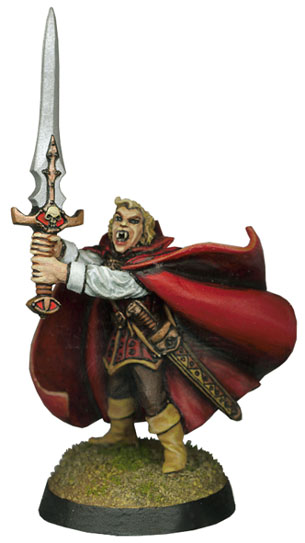 This fellow on the left is aptly named "The Crimson Knight" unfortunately he's died in the game already and been reincarnated as a gnome. The excellant mini is by Reaper minis. |